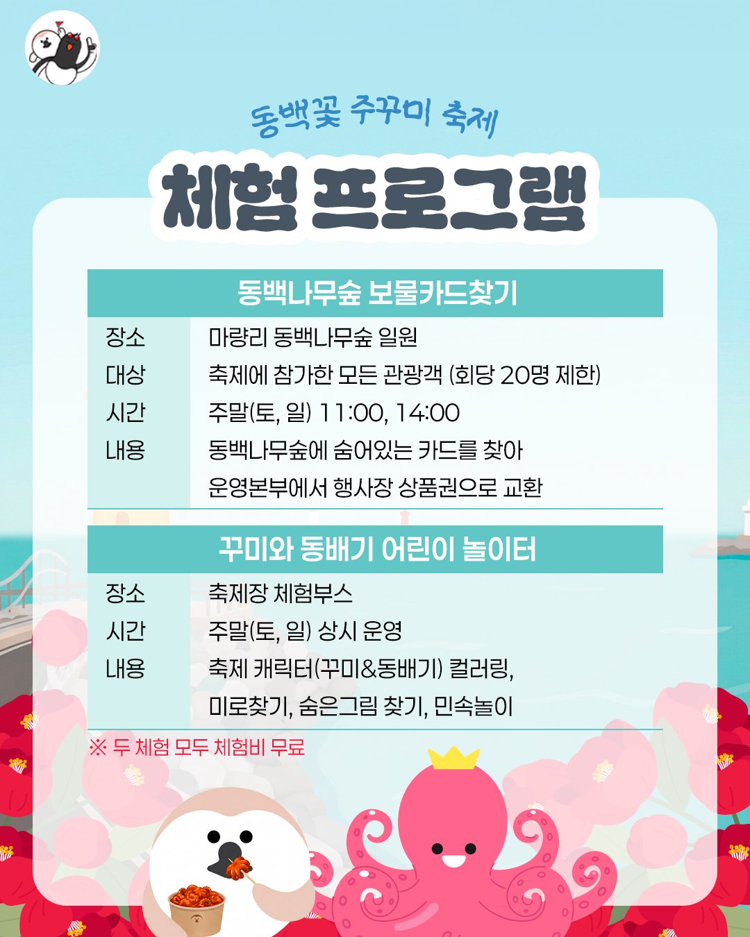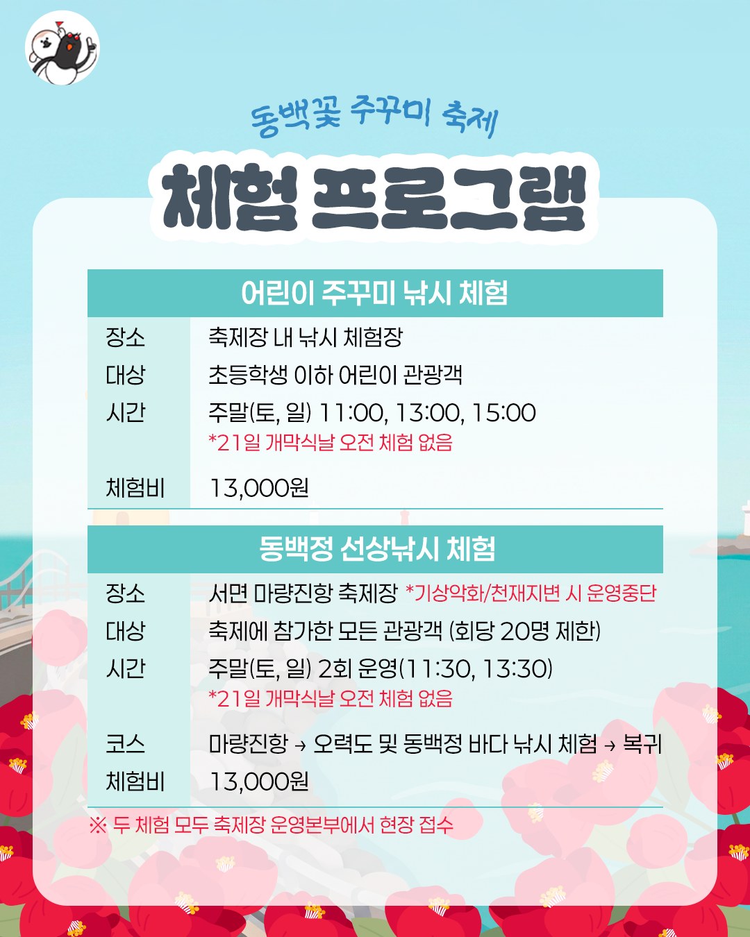 그리고 주말에는 방문객이 많은 편이라, 동백꽃도 보고 체험도 여유 있게 즐기고 싶다면 가능하면 오전 시간대에 가는 쪽이 좀 더 편할 수 있어요. 보물카드 찾기나 낚시 체험처럼 시간이 정해진 프로그램은 먼저 체크해두면 동선 짜기도 훨씬 수월하고요.