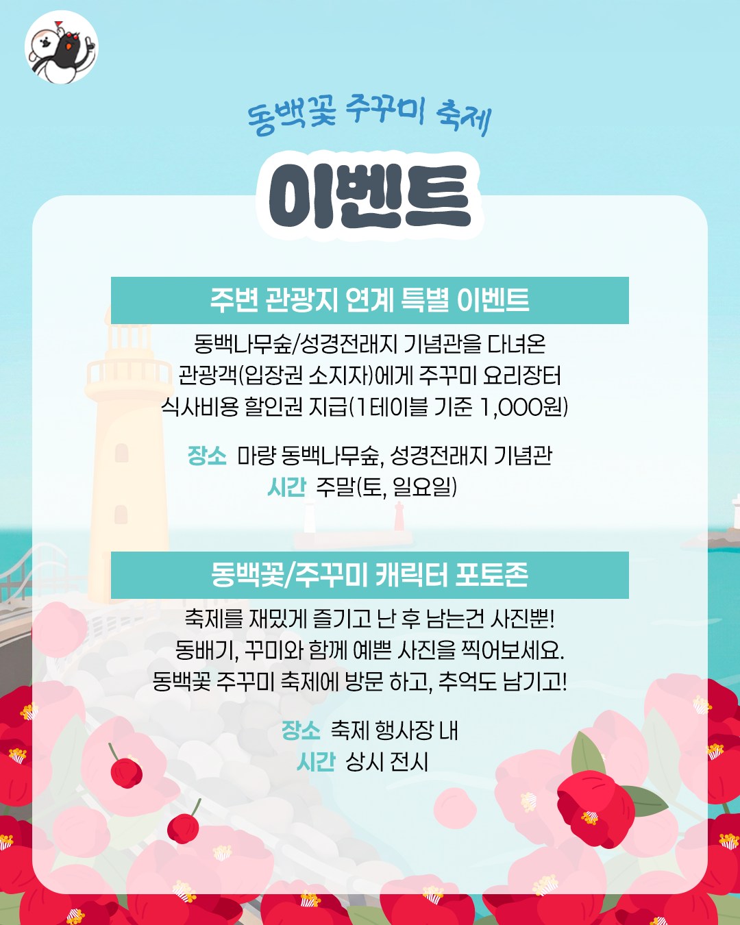 이 밖에도 행사장 내에서는 동백꽃·주꾸미 캐릭터 포토존이 상시 전시되고, 주변 관광지 연계 특별 이벤트도 운영됩니다. 동백나무숲 또는 성경전래지 기념관 입장권 소지자에게 주꾸미 요리장터 식사비 할인권을 지급하는 이벤트가 있으며, 1테이블 기준 1,000원 할인으로 안내돼 있어요. 축제만 보고 돌아오기보다 주변 관광지까지 함께 묶어서 둘러보면 조금 더 알차게 즐길 수 있겠습니다.